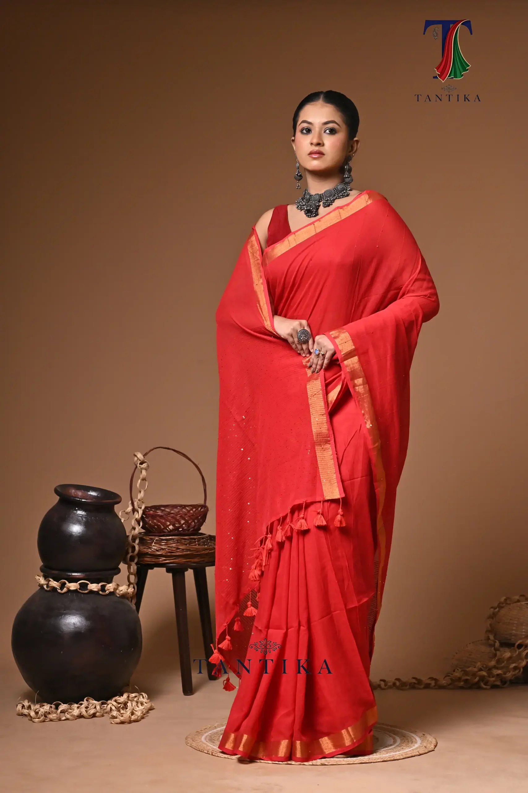 Red mull Cotton sequence handloom Saree