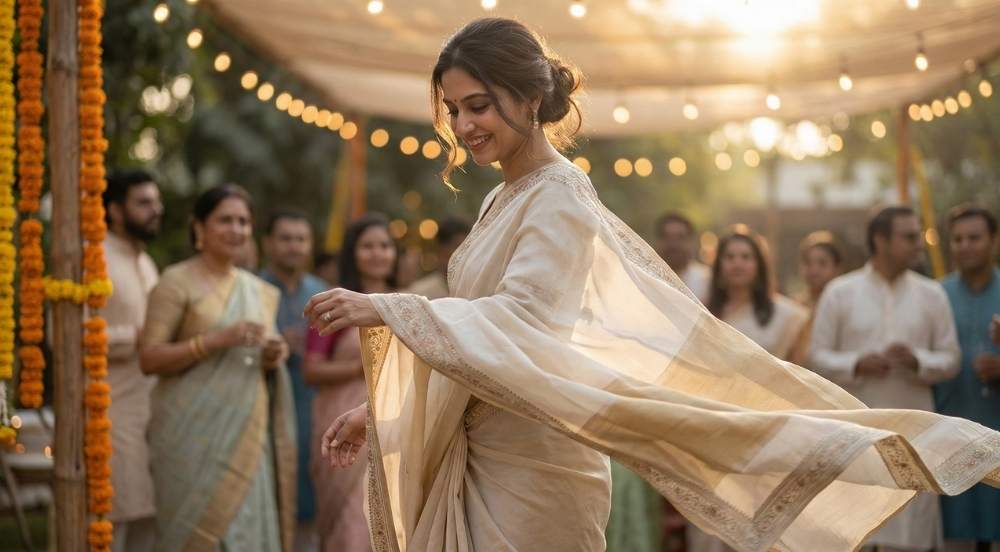 Matka silk is incredibly light, breathable, and comfortable for hours, in contrast to bulky Banarasi or Kanjivaram sarees.