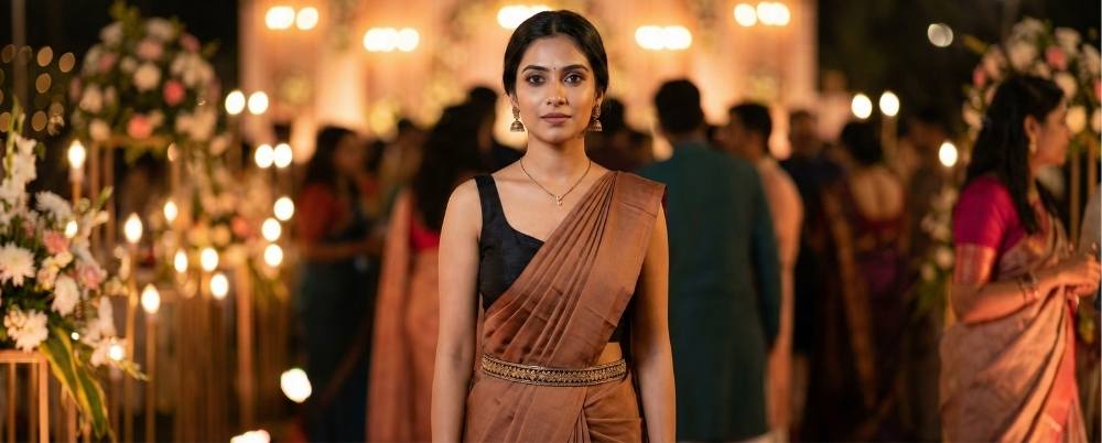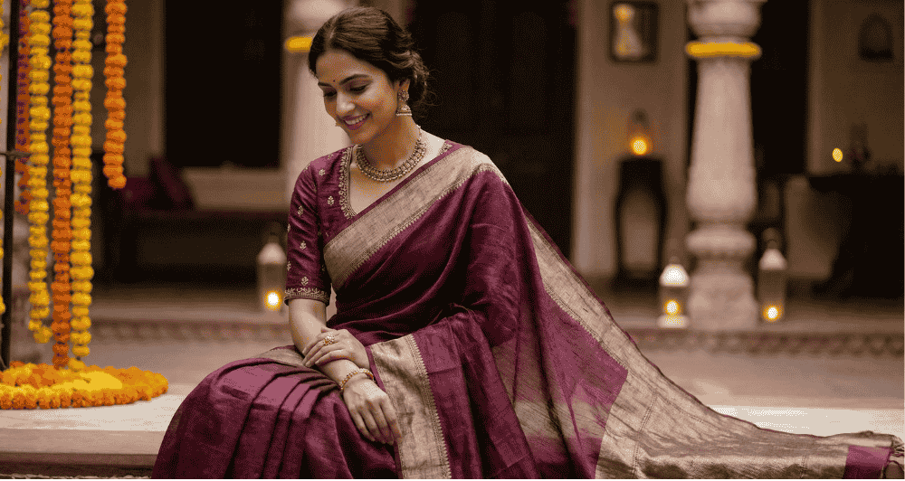 Style your Matka silk saree with a sleeveless blouse, temple jewelry, minimal earrings or a belt for a modern twist.